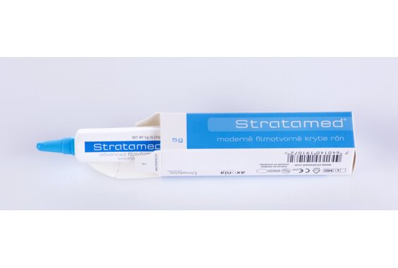 Stratamed je semiokluzivní, samoschnoucí průhledný gel.